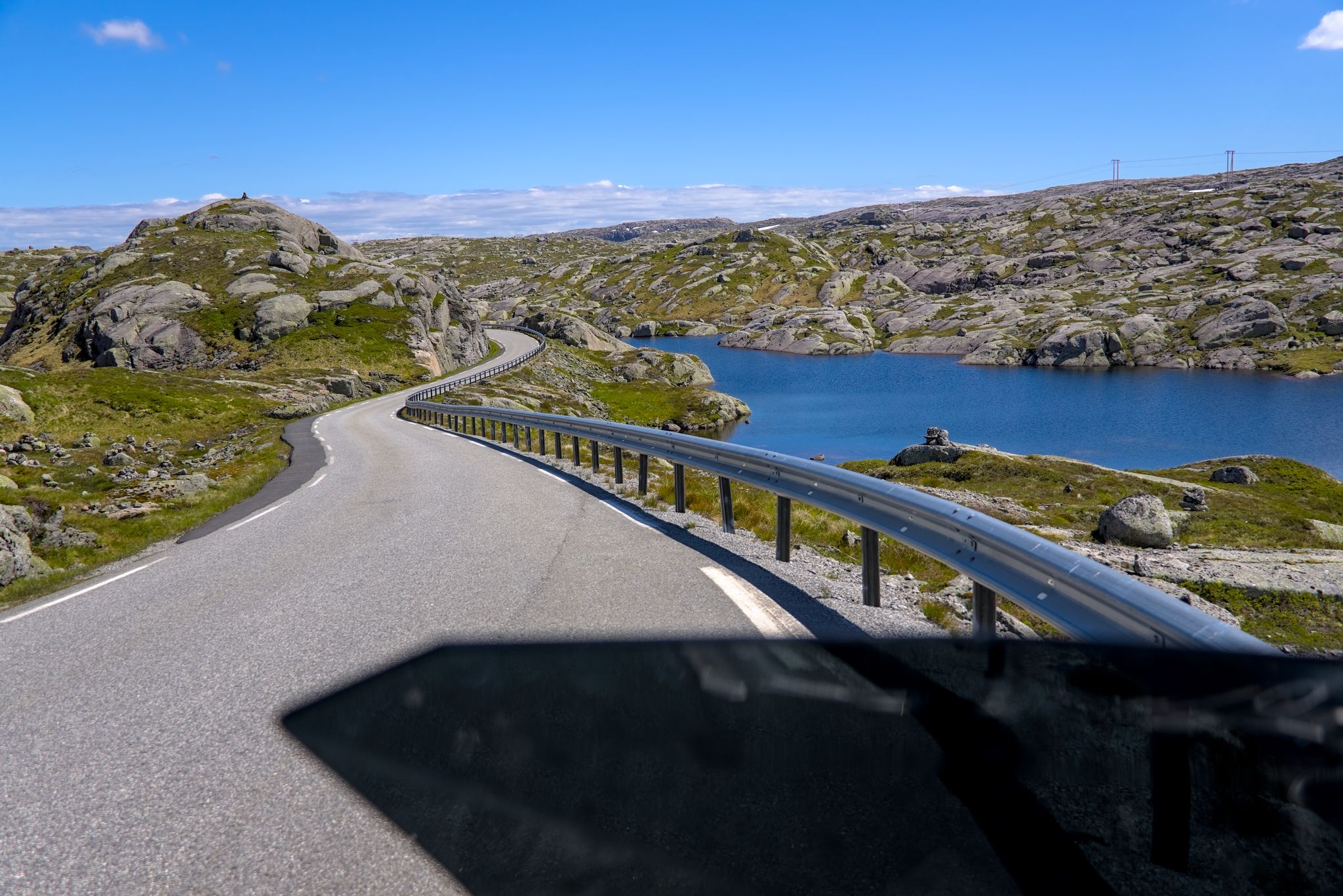 Um die Mittagszeit erreichten wir den Eingang zu den Lyseveien. Die Straße schlängelt sich traumhaft kurvig über das Fjell Richtung Lysebotn und dem Lysefjord.