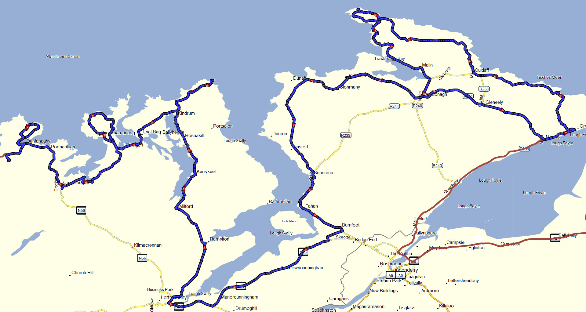 Bei Moville bogen wir von der Route ab, da wir im Hotel Ballyliffin Lodge (G-Maps) den Abend und die Nacht verbringen wollten. Schönes Hotel, lecker Essen und großes Zimmer.