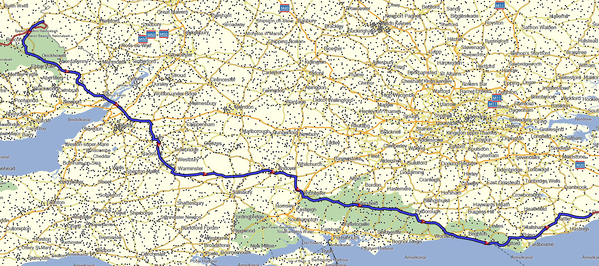 Bristol auf der M4 umfahren, durch Bath weiter auf der Landstraße am Cranborne Chase National Landscape vorbei, sowie durch den South Downs National Park.