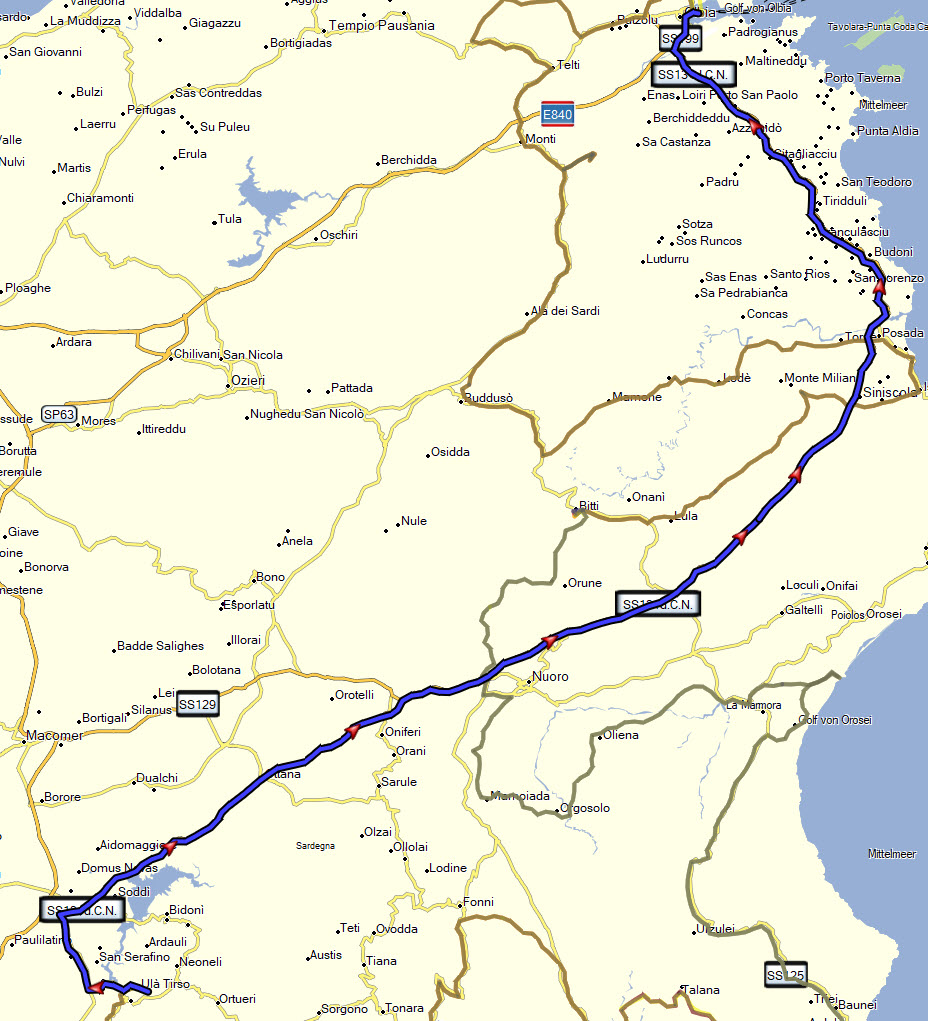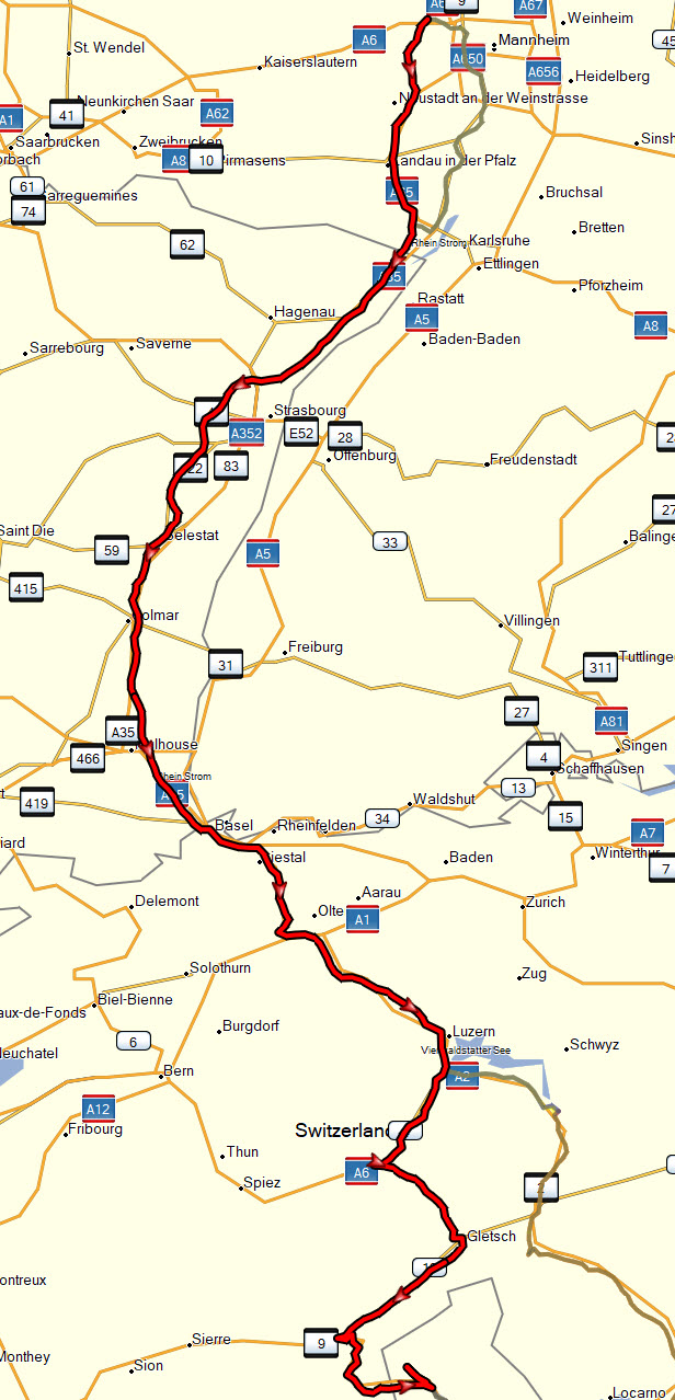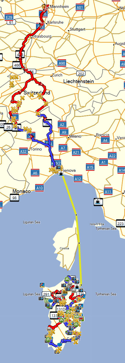 Die Anfahrt sollte großteils über die Autobahn führen und vor Genua durch die Berge. Anschließend mit der Nachtfähre übersetzen nach Olbia auf Sardinien. In der Schweiz sollte als Auflockerung der Autobahnfahrt auf dem Hinweg der Grimselpass und auf dem Rückweg den Großen Sankt Bernhard Pass dienen.