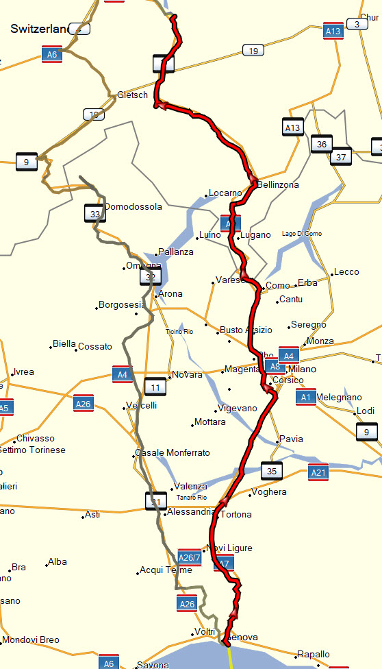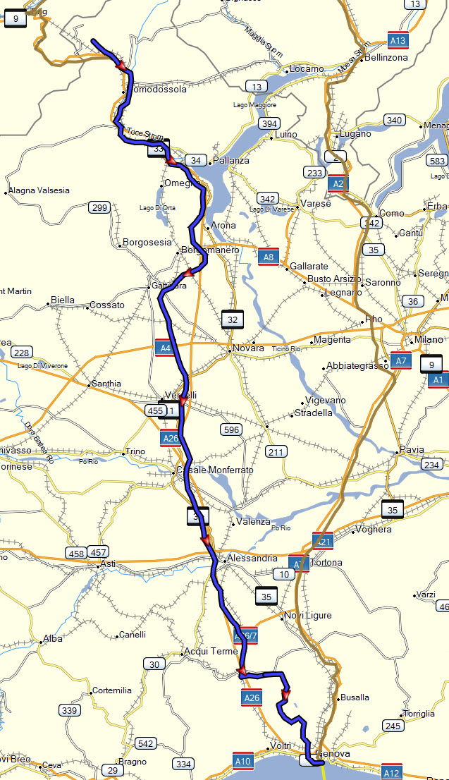 Die A26 bis Ovada, danach noch durch die Berge über den Colle di Praglia bis Genua. Tolle kurvige Straße, schöne Ausblicke.