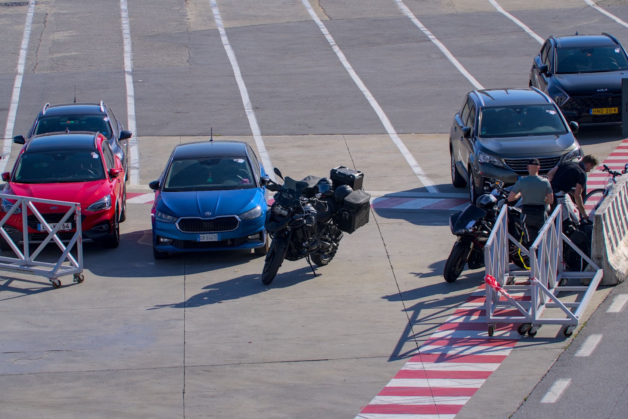 Voll die Hektik beim Boarden. Das Personal war ziemlich genervt und hat herum geschrieen. Hammer krass fand ich, dass das Schiff keinerlei Spanngurte zur Verfügung stellt. Stattdessen musste die Motorräder an der Bordwand entlang aufgestellt werden und mit einem läppischen kleinen Strick festgemacht werden. So etwas habe ich weder in Norwegen, Schottland, Irland noch nach England erlebt.