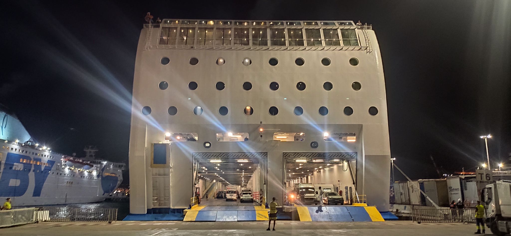 Am Hafen noch einen netten Biker mit seiner Africa Twin kennengelernt und uns gut unterhalten. Die Wartezeit war lang, es hieß um 19:00 könnten wir aufs Schiff (Mobyline). Dieses kam aber erst sehr spät, ca. 21:00, so dass es erst um 22:00, statt 21:30 losging.