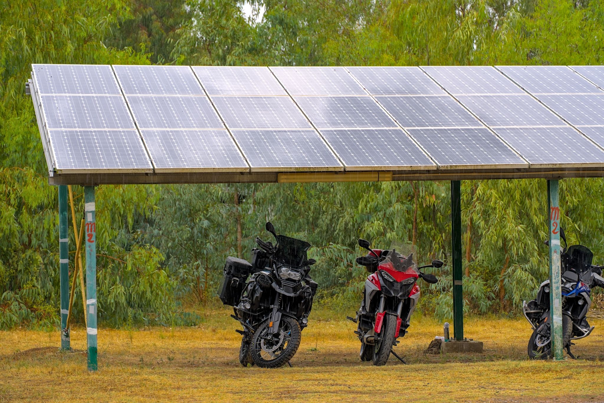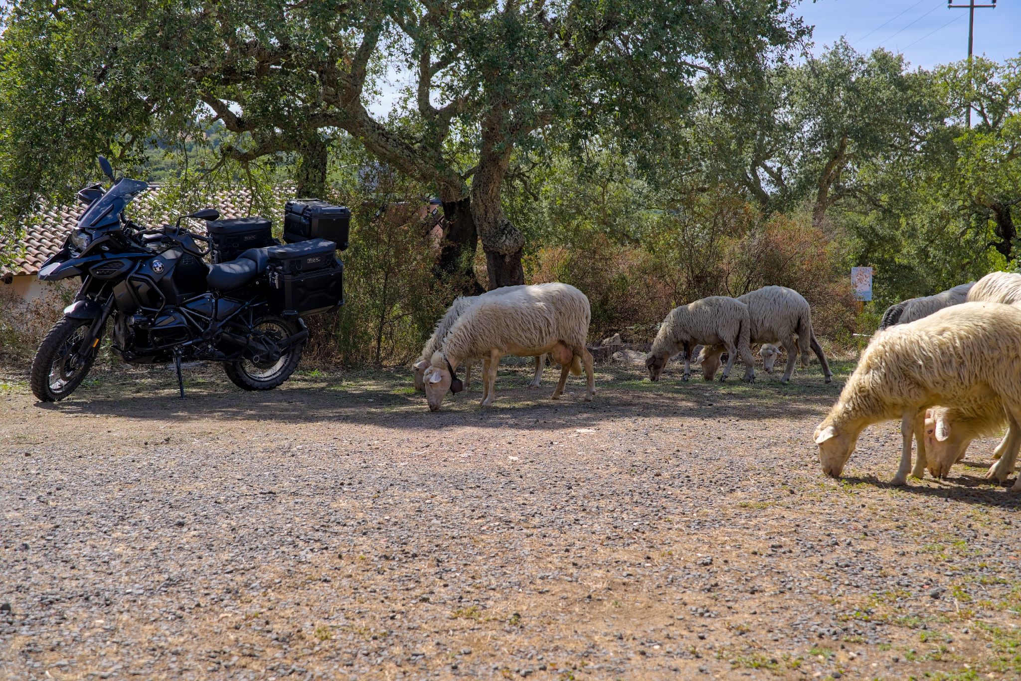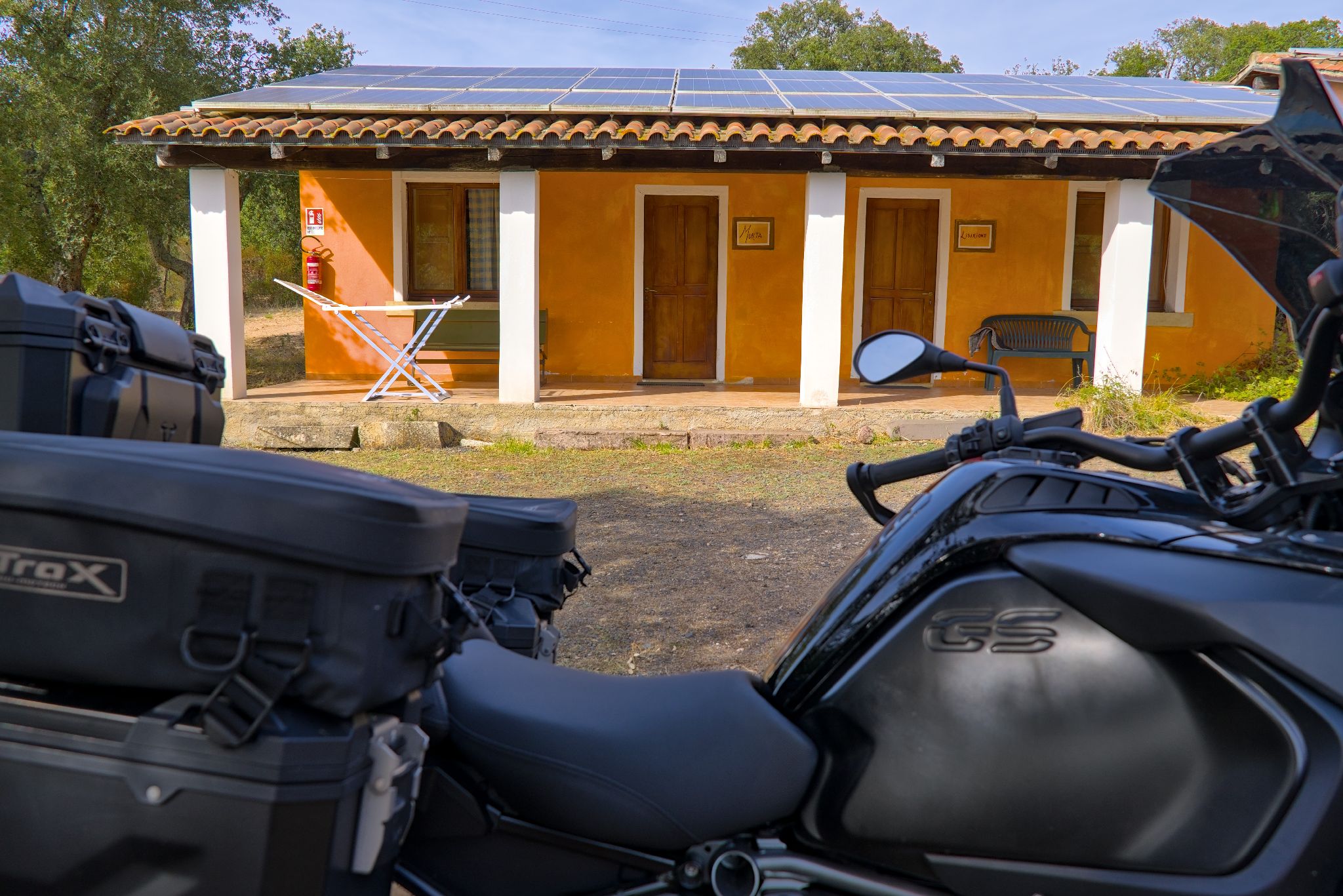 Bei Ankunft kam ein heftiges Gewitter an, welches uns seit Baunei im Nacken hing. Klar, wir sind einmal auf Sardinien und genau dann regnet es 😉 in diesem Fall war es ein Segen, nach dem heißen Tag. Die Motorräder konnten unter einem Solar-Carport untergestellt werden.