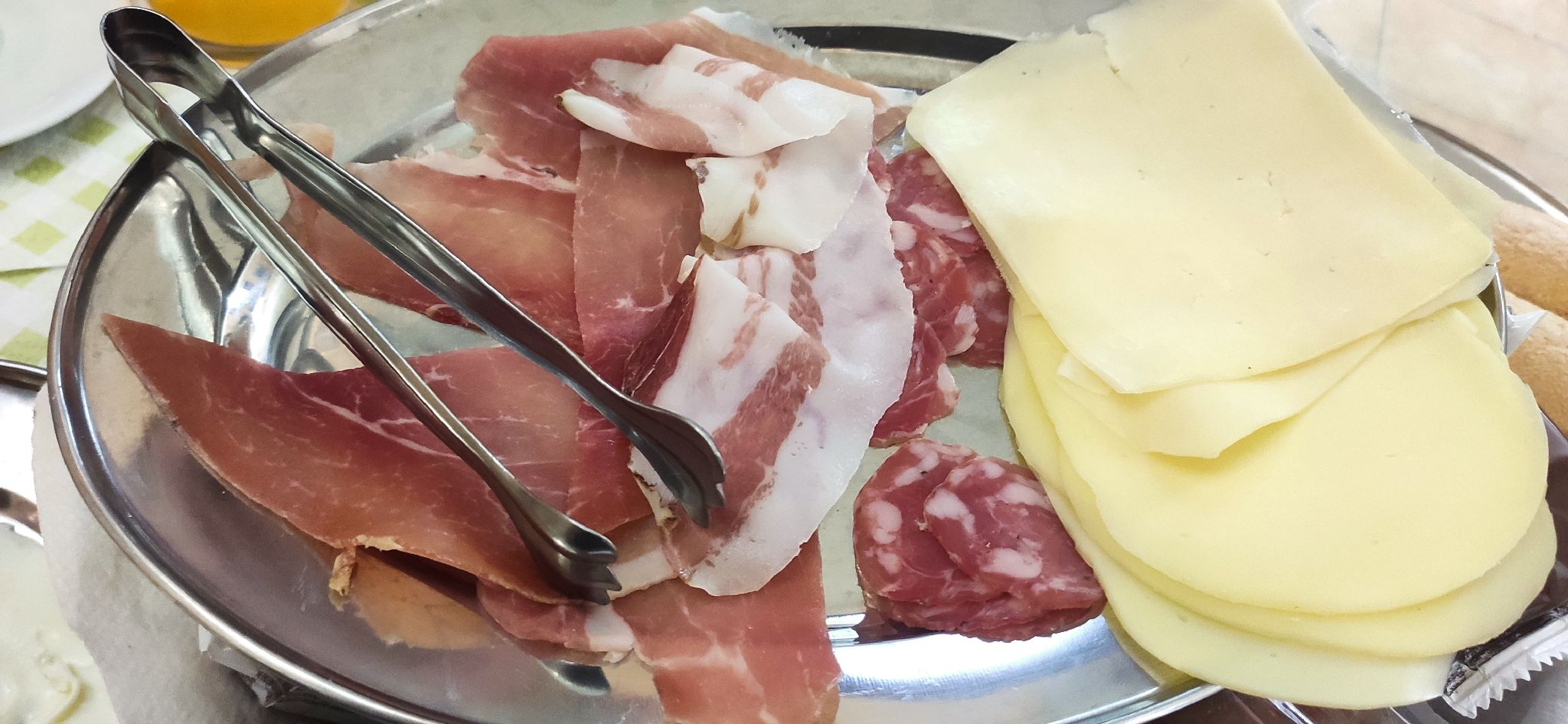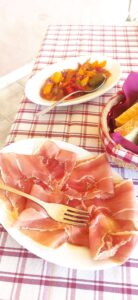 Tolles Frühstück mit sardischen Schinken, Salami, Ziegen- & Schafskäse, sowie Ei im sardischen Hartweizenbrot (Fladen).