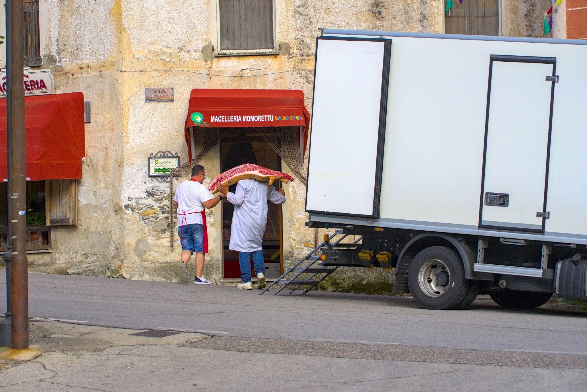 In einem Ort konnten wir bei einer Pause beobachten, wie der lokale Metzger beliefert wurde.