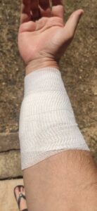 Von der Bank vor dem Bungalow aufgestanden und wollte zu meiner Q, um die tägliche Sichtprüfung zu machen. Irgendwie bin ich beim Schritt von der Veranda unglücklich aufgetreten und gestürzt. Mein rechter Unterarm hat zu allem Überfluss ein Stück Armierungseisen gefunden 😯 . Böse Wunde zugezogen. Nach einer Erstversorgung haben die Besitzer meine Frau und mich dann in das nächstgelegene Krankenhaus gefahren, wo die Wunde (4cm und ziemlich tief) professionell gereinigt und auch genäht wurde. Ich hatte Glück, dass keine Gefäße, Nerven oder Sehnen verletzt wurden.