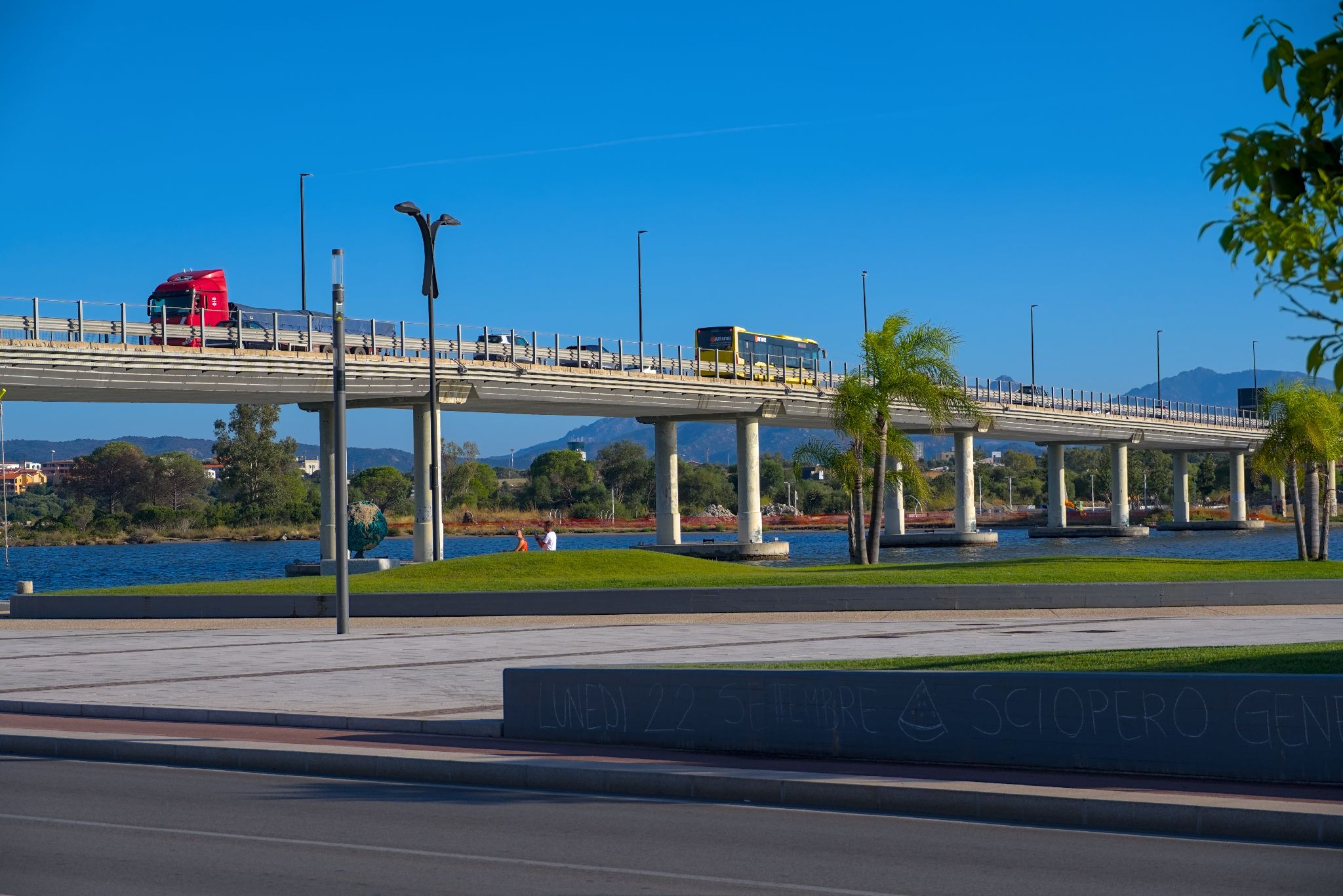 Auf der einspurigen Brücke Ponte Marceddi bei Marceddi eine Bucht überquert.